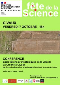 Conférence organisée dans le cadre de la Fête de la Science, sur les récentes fouilles réalisées sur le site de la villa de La Croche, présentant les différentes techniques et méthodes utilisées. Conférence par Séverine Lemaître (HeRMA / Université de Poitiers).