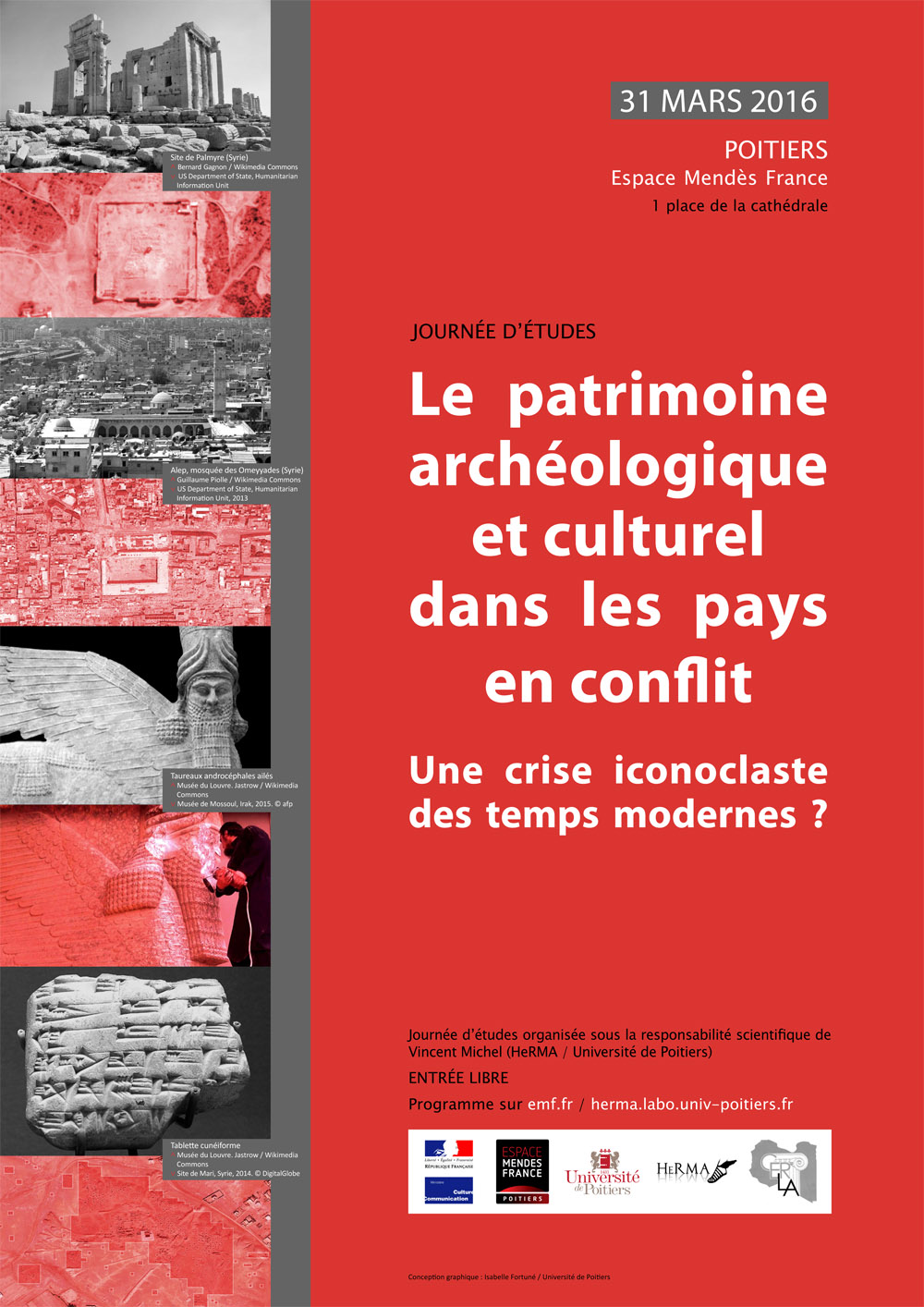 La journée d’études porte sur le sort du patrimoine archéologique et culturel dans les pays en guerre, objet de toutes les convoitises, les contrebandes et les trafics mais aussi malheureusement victime de vandalisme et de destruction.