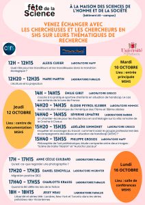 Venez échanger avec les chercheuses et les chercheurs en sciences humaines et sociales sur leurs thématiques de recherche.